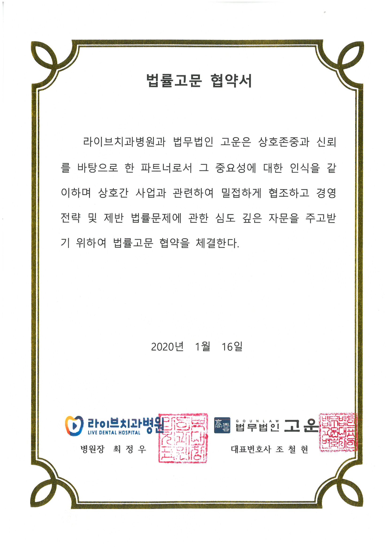 법무법인 고운은 2020. 1. 16. 라이브치과병원과 법률고문협약을 체결하였습니다.
