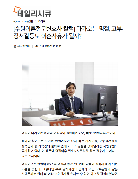* “다가오는 명절, 고부·장서갈등도 이혼사유가 될까?”로 언론보도 [조철현대표변호사님]