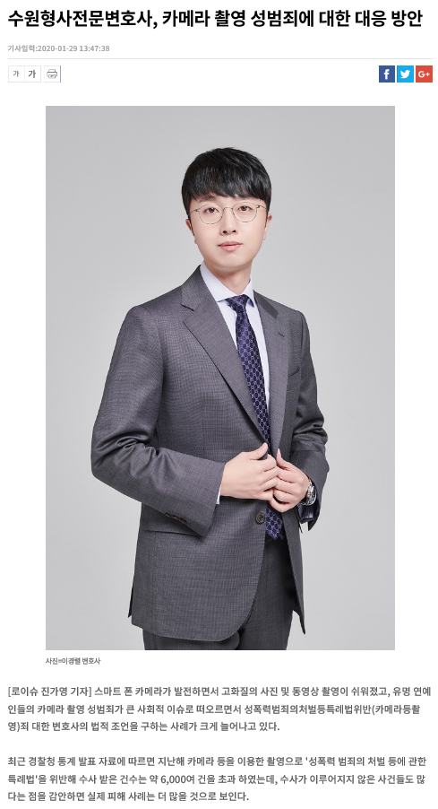 * “수원형사전문변호사, 카메라 촬영 성범죄에 대한 대응 방안”으로 로이슈에 게재[이경렬변호사님]