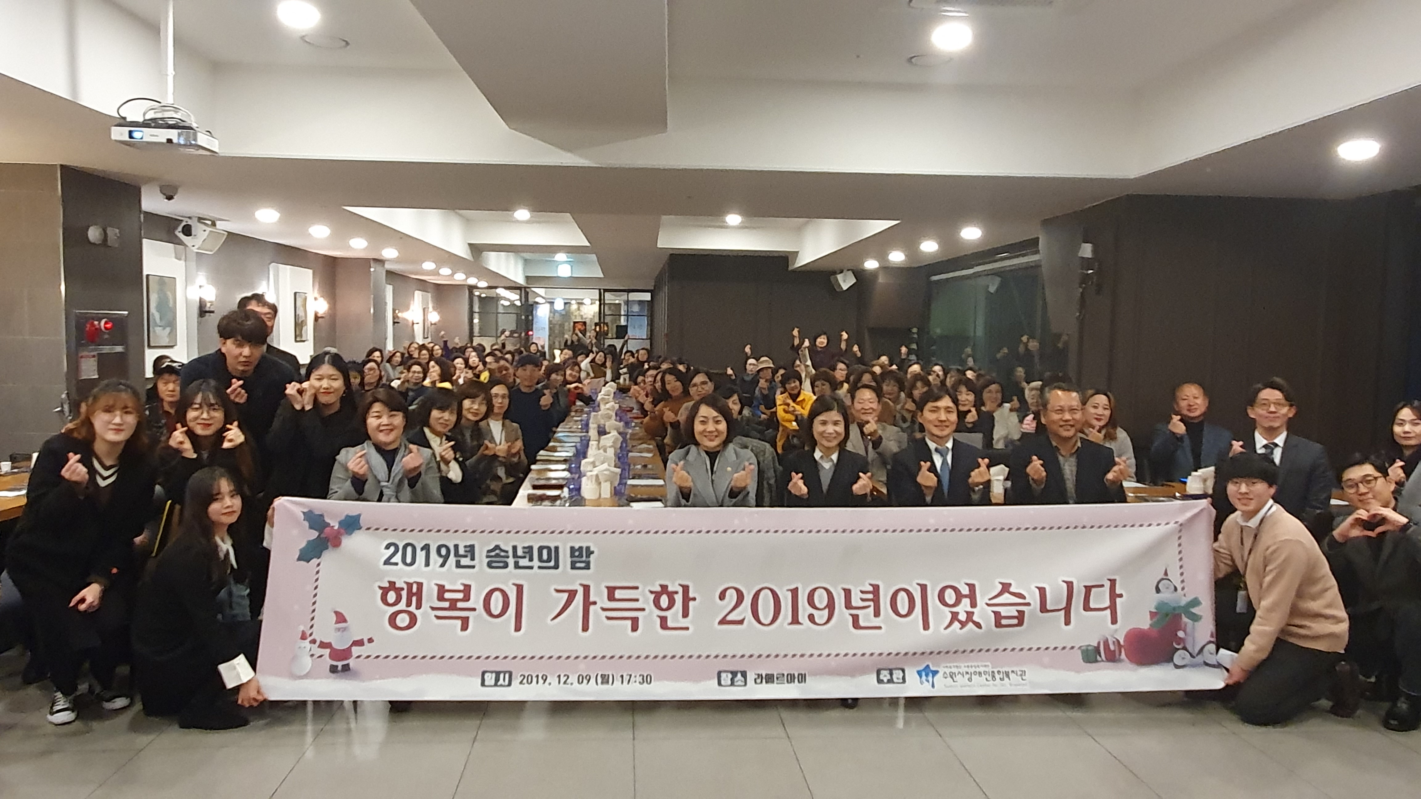 이번 행사는 “행복이 가득한 2019년이었습니다.”를 주제로 진행되었으며, 사진 왼편에서부터 수원시의회 조명자 의장님, 경기도의회 안혜영 부의장님, 수원장애인복지관 최영화관장님, 법무법인 고운 조철현 대표님, 영통발전연대 이영종부회장님 그리고 여러 후원자 및 자원봉사자 등 한 해 동안 복지관과 함께 동행해준 감사한 분들과 함께 진행되었습니다.