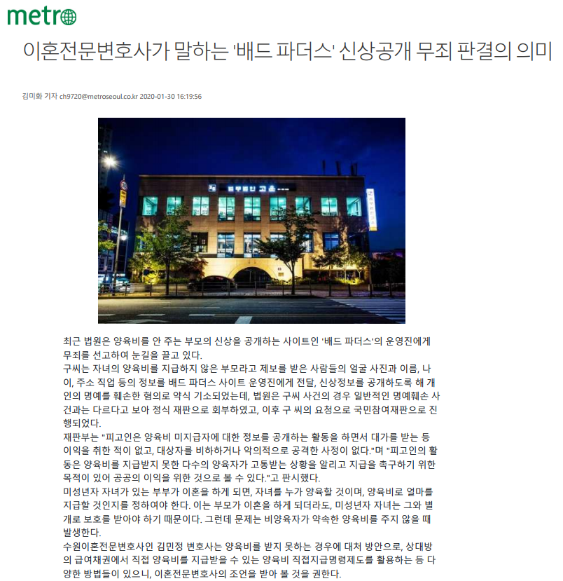 * “이혼전문변호사가 말하는 ‘배드 파더스’ 신상공개 무죄판결의 의미”로 언론보도 [김민정변호사님]