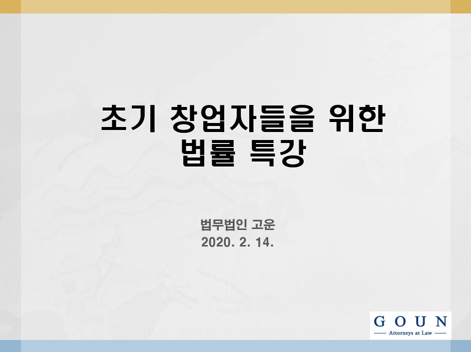 법무법인 고운의 기업상사팀은 외부 기업인들과 정보를 공유하며 끊임없이 연구하고 있습니다. 또한, 초기 창업자분들에게 어려울 수 있는 법률정보를 쉽게 전달해드리기 위하여 유튜브 ‘고운변호사들 채널’에 관련 영상을 업로드하여 정보를 제공하고 있습니다.