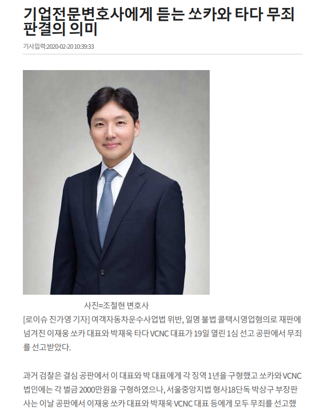 *“기업전문변호사에게 듣는 쏘카와 타다 무죄판결의 의미”로 언론보도[조철현대표변호사님]
