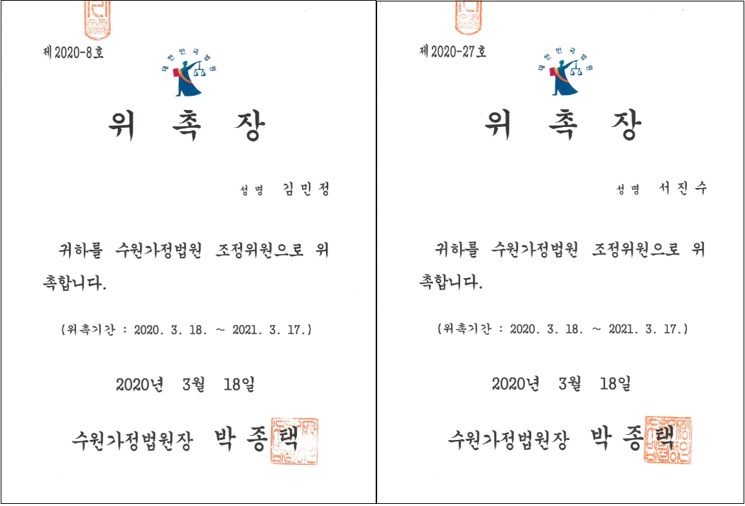 * 수원가정법원 가사 조정위원으로 위촉 [김민정,서진수변호사님]