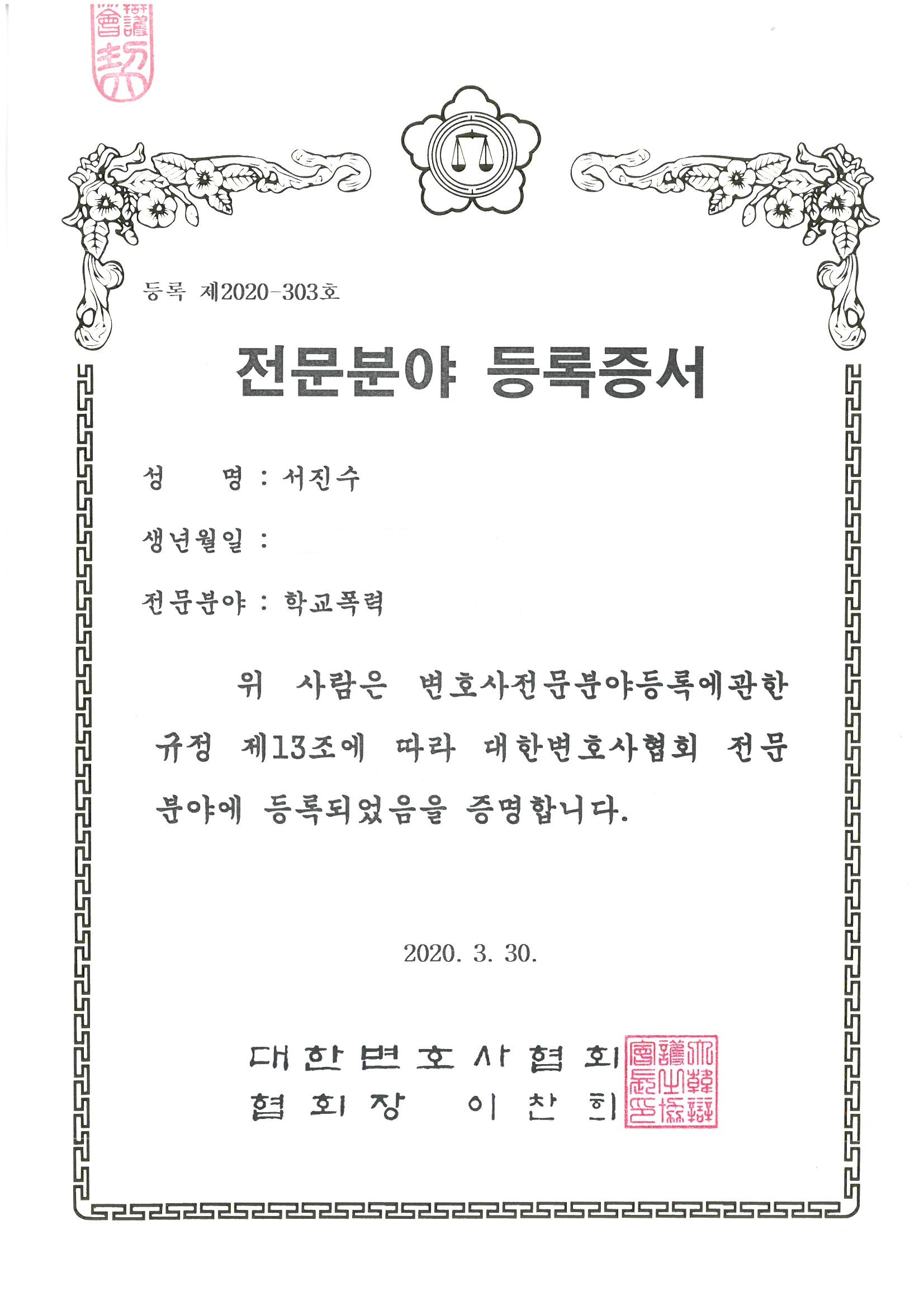 * 대한변호사협회 인정 학교폭력전문변호사 등록 [서진수변호사님]
