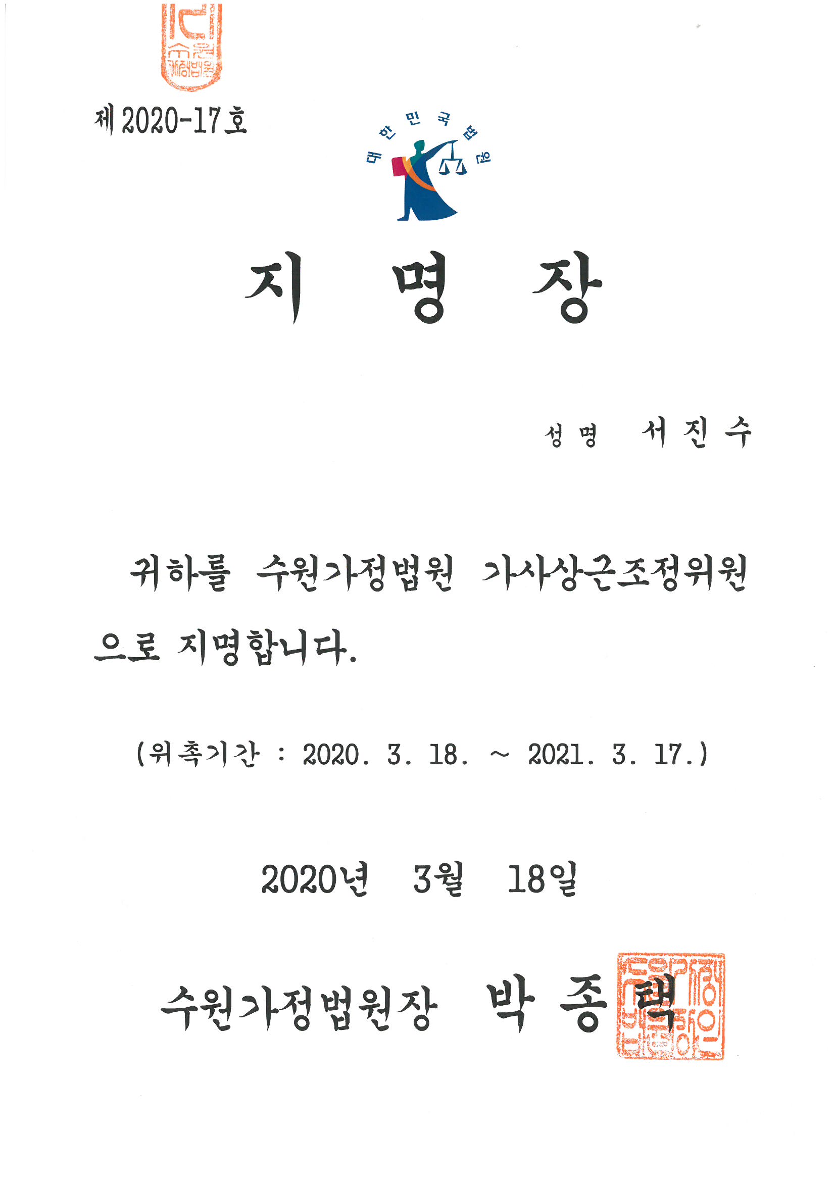 * 수원가정법원 가사상근조정위원으로 지명 [서진수변호사님]