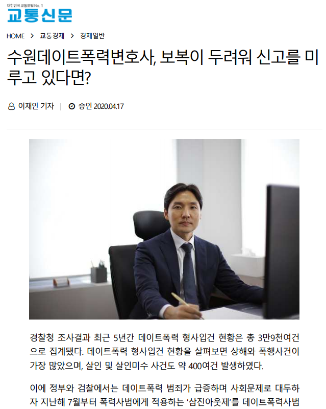 법무법인 고운의 조철현대표변호사님이 교통신문에 “수원데이트폭력변호사, 보복이 두려워 신고를 미루고 있다면?”으로 게재되었습니다.