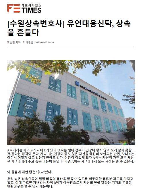법무법인 고운의 김민정변호사님이 FE타임스에 “[수원상속변호사] 유언대용신탁, 상속을 흔들다”로 게재되었습니다.