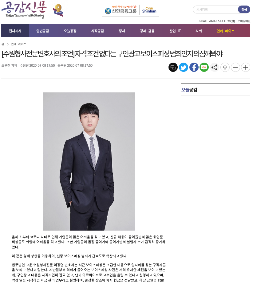 법무법인 고운의 이경렬변호사님이 공감신문에 “[수원형사전문변호사의 조언] 자격조건없다는 구인광고, 보이스피싱범죄인지 의심해봐야”로 게재되었습니다.