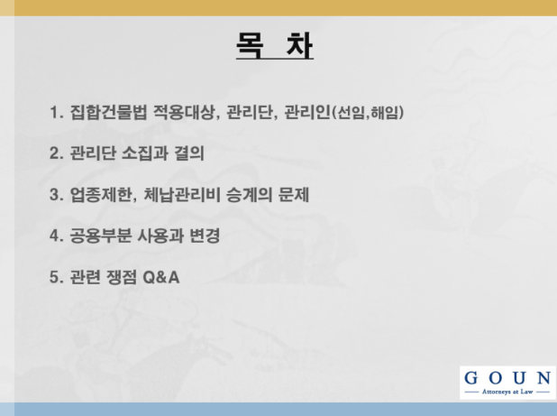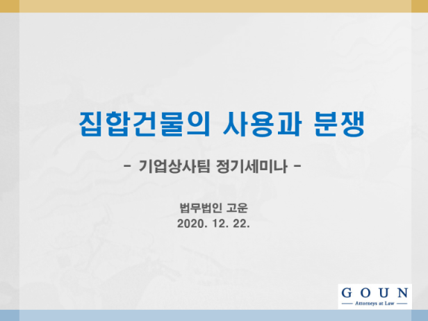 법무법인 고운의 기업상사팀이 2020.12.22.(화) “집합건물의 사용과 분쟁”에 대한 법률세미나를 개최하였습니다.