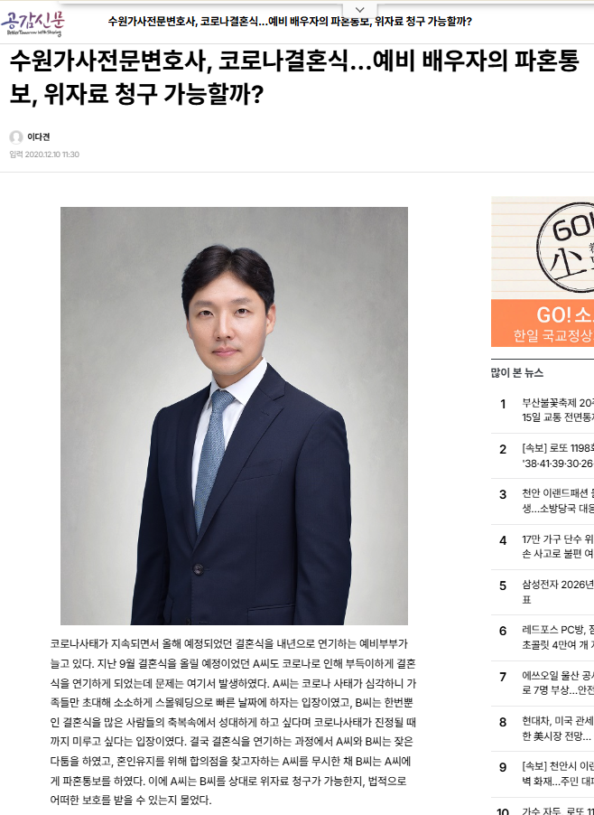 법무법인 고운의 조철현대표변호사님이 공감신문에 “수원가사전문변호사, 코로나결혼식...예비 배우자의 파혼통보, 위자료 청구 가능할까?”로 언론보도되었습니다.