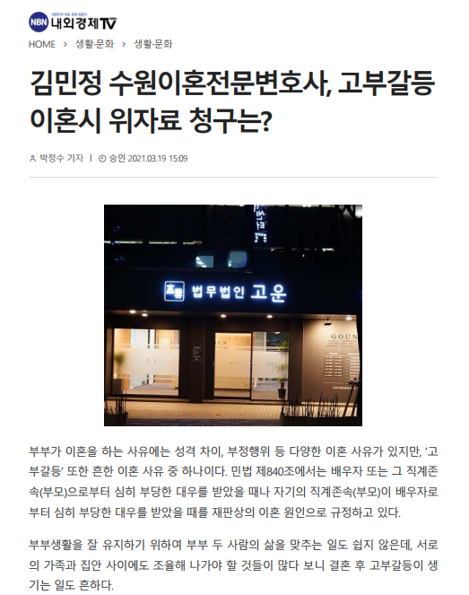 * “수원이혼전문변호사, 고부갈등 이혼시 위자료 청구는?”으로 언론보도