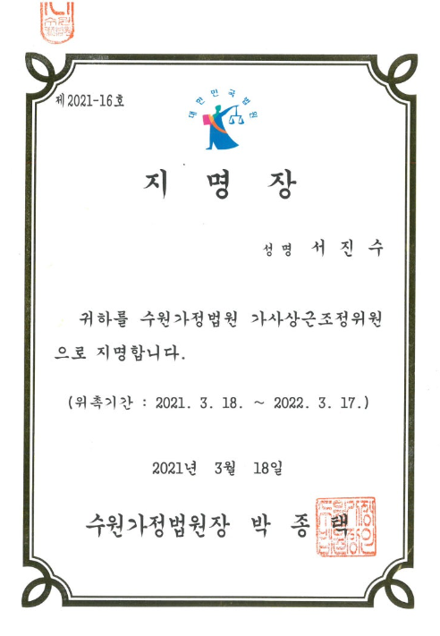 법무법인 고운의 서진수변호사님이 수원가정법원 가사상근조정위원으로 위촉되어 2021.3.18. ~ 2022.03.17. 동안 가사상근조정위원으로 활동하시게 되었습니다.