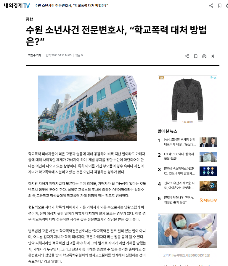 * 수원 소년사건 전문변호사, “학교폭력 대처 방법은?”으로 언론보도