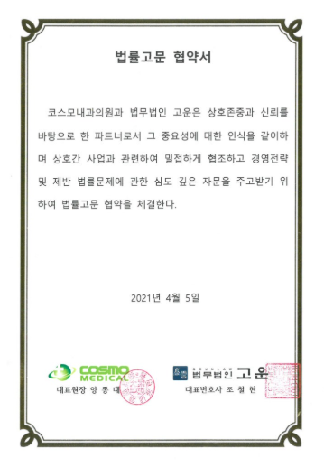 법무법인 고운은 2021.04.05. 코스모내과의원과 법률고문협약을 체결하였습니다.