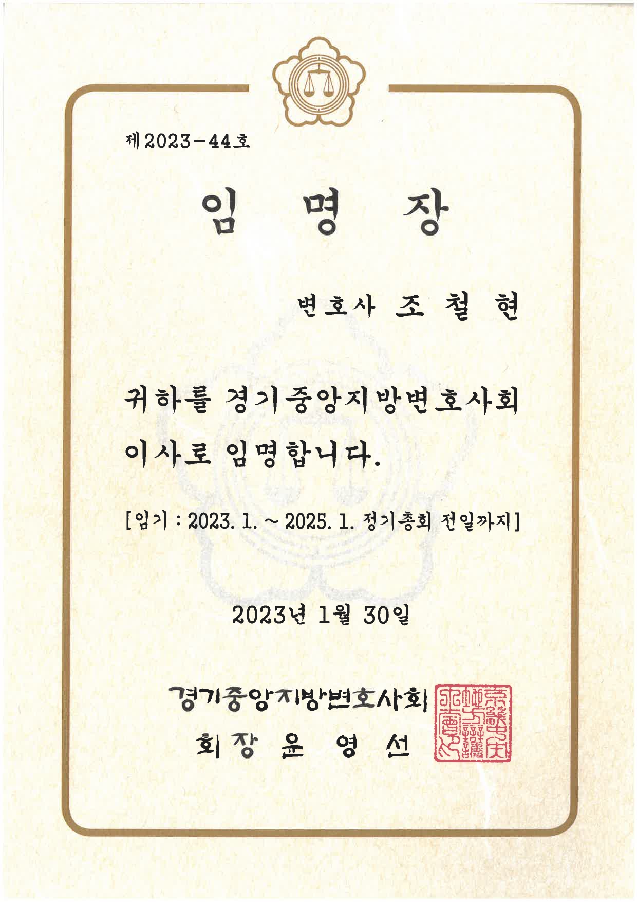 경기중앙지방변호사회의 이사로 임명되셨습니다.