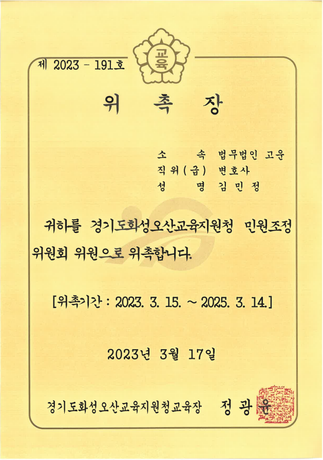 * 김민정 변호사님, 경기도화성오산교육지원청 조정위원회 위원으로 위촉
