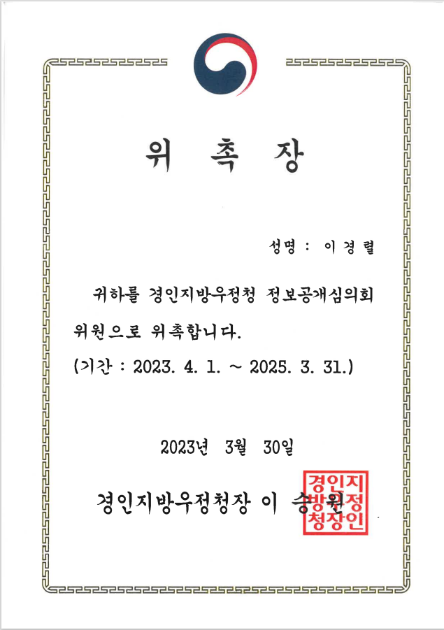 * 이경렬 변호사님, 경인지방우정청 정보공개심의위원 위촉