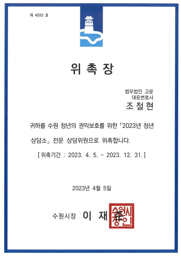 법무법인 고운의 조철현 대표변호사님께서 수원시 청년 상담소의 전문 상담위원으로 위촉되셨습니다.