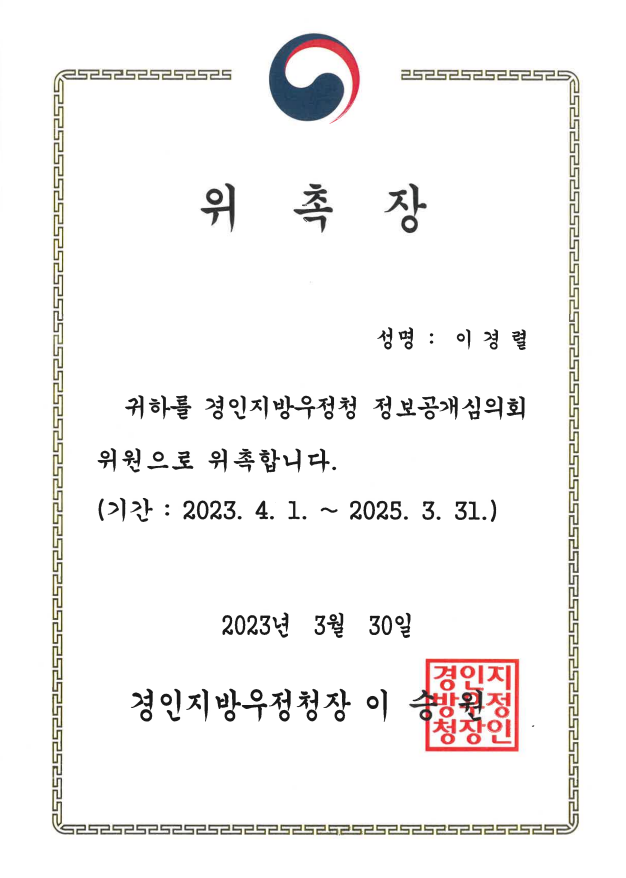 올해 3월부터 경인지방우정청 정보공개 심의위원으로 위촉되었습니다.