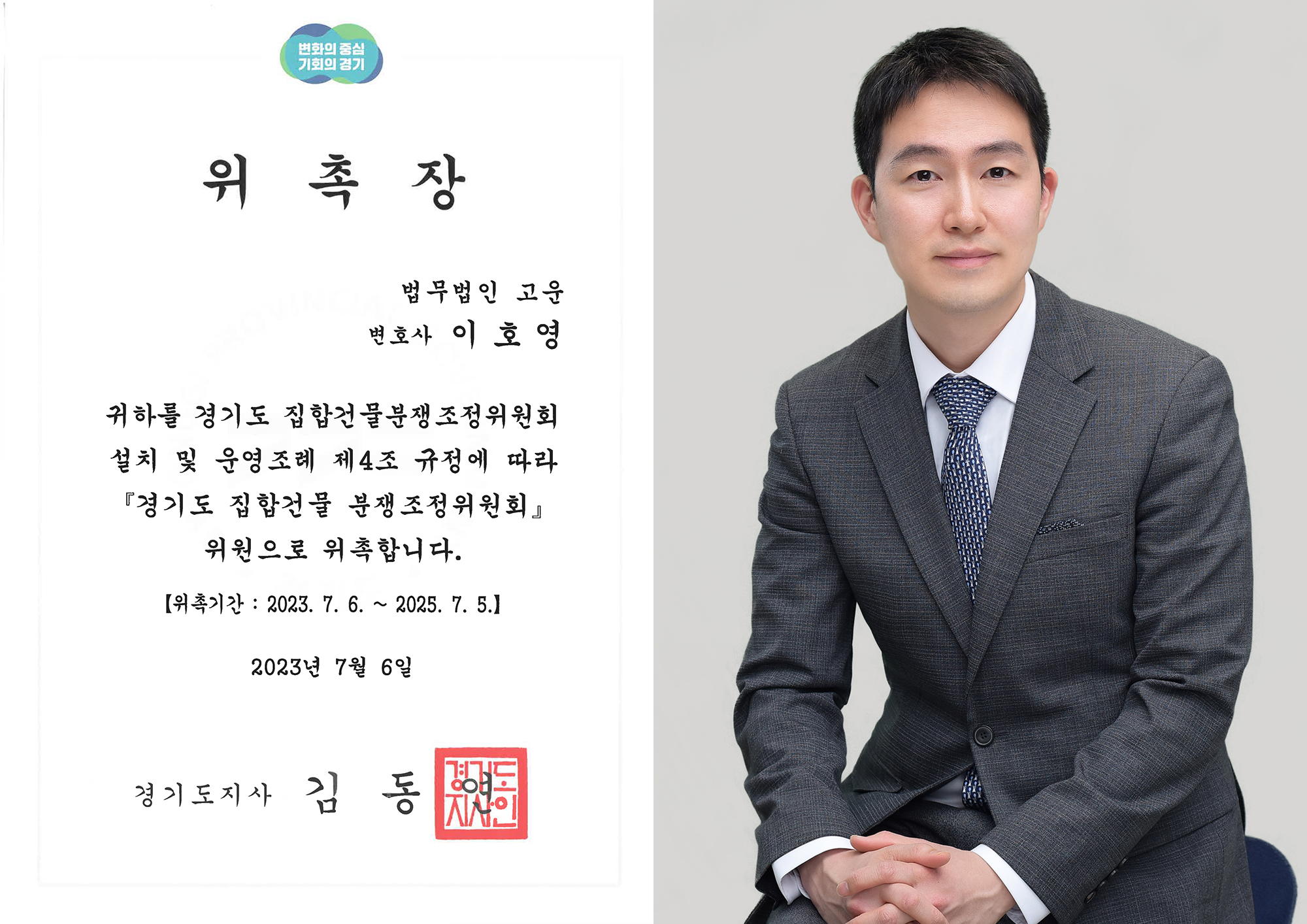 지난 7월 6일에 법무법인 고운의 이호영 변호사가 경기도집합건물분쟁조정위원회 위원으로 위촉되었습니다.