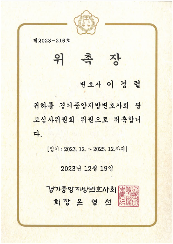 * 이경렬 파트너변호사, 경기중앙지방변호사회 광고심사위원회 위원 위촉
