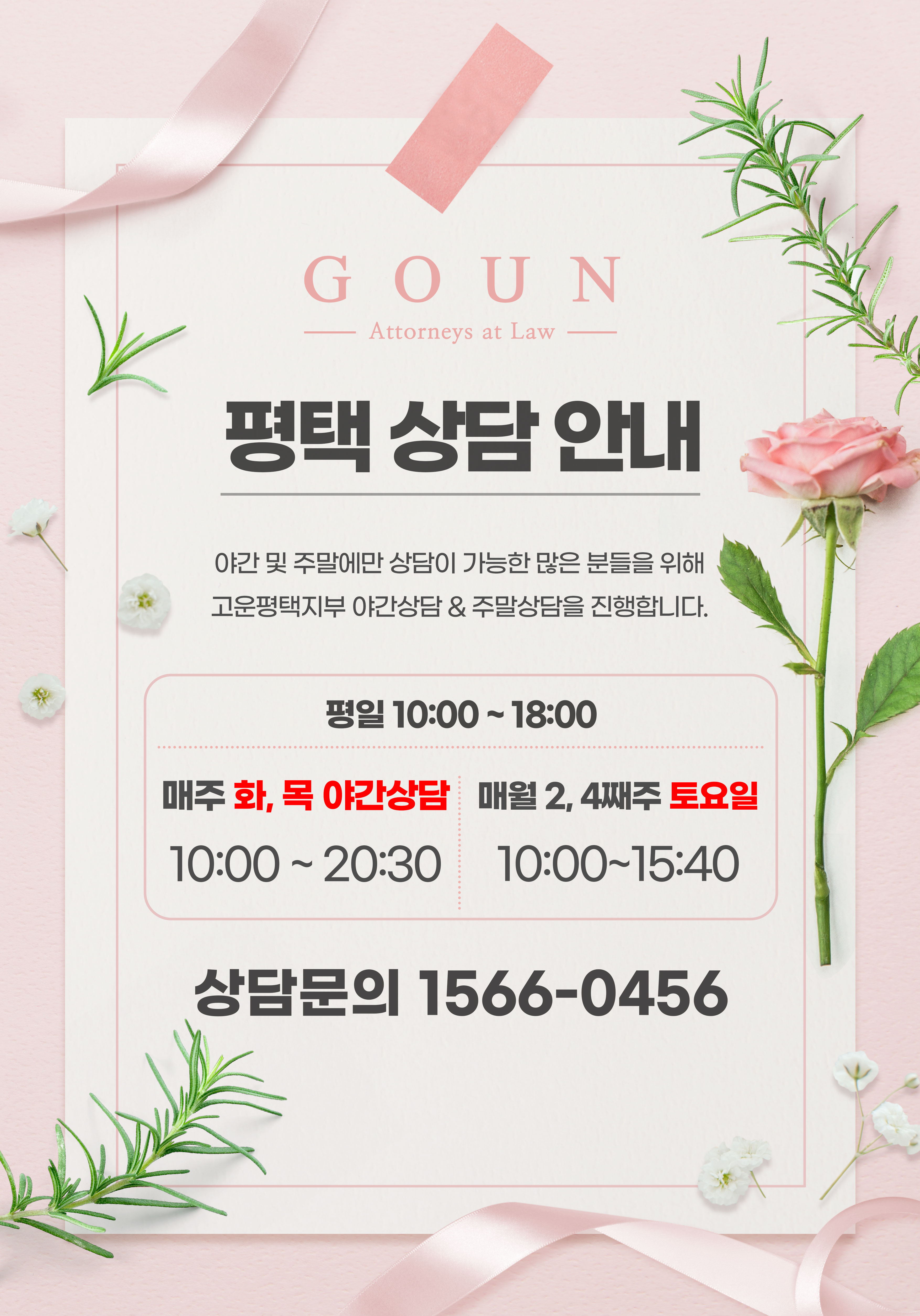 법무법인 고운 평택 분사무소가 야간 및 주말 상담을 개시하였습니다.
