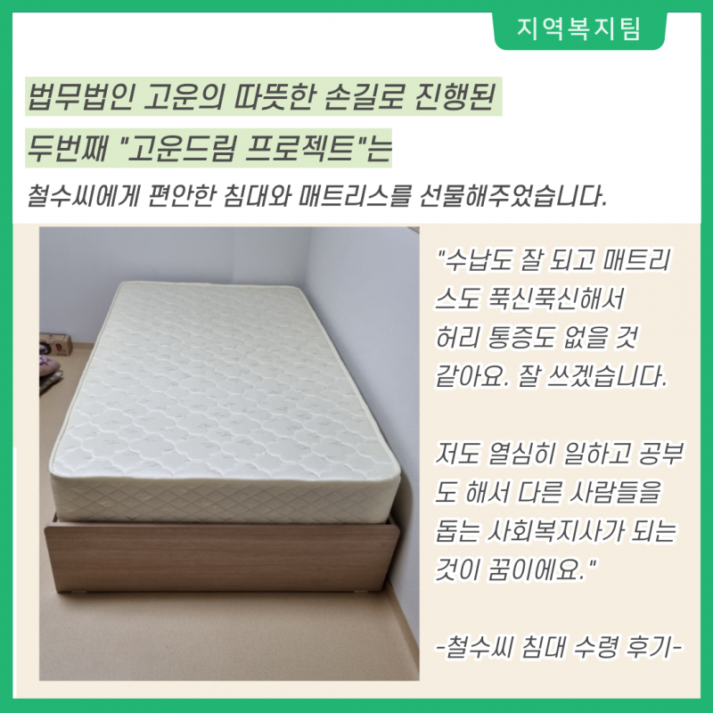 고운드림프로젝트는 오랜 병원생활을 정리하고 새로움 보금자리에서 새롭게 자립하려는 철수씨를 위해 수납이 가능한 침대와 매트리스를 선물했습니다.