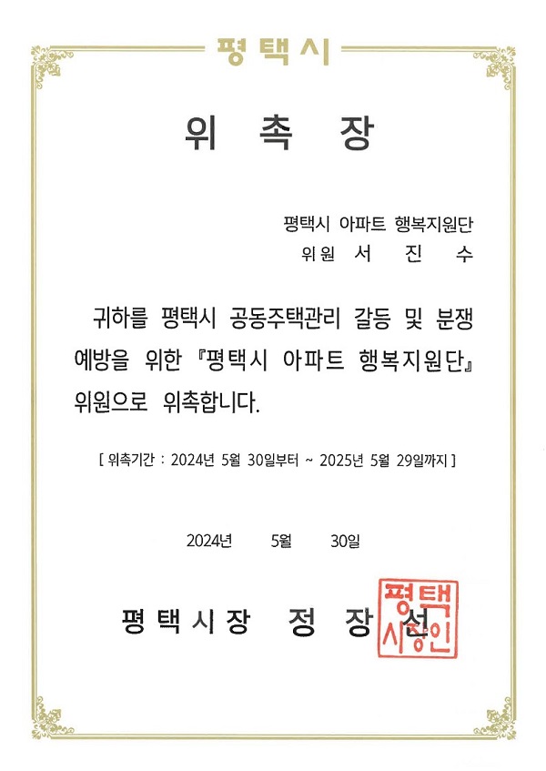 법무법인 고운의 부동산사건 전담팀장으로 활동 중인 서진수 부동산전문변호사님이 지난 30일 ‘평택시 찾아가는 아파트 행복지원단’위촉식에 참석하였습니다.