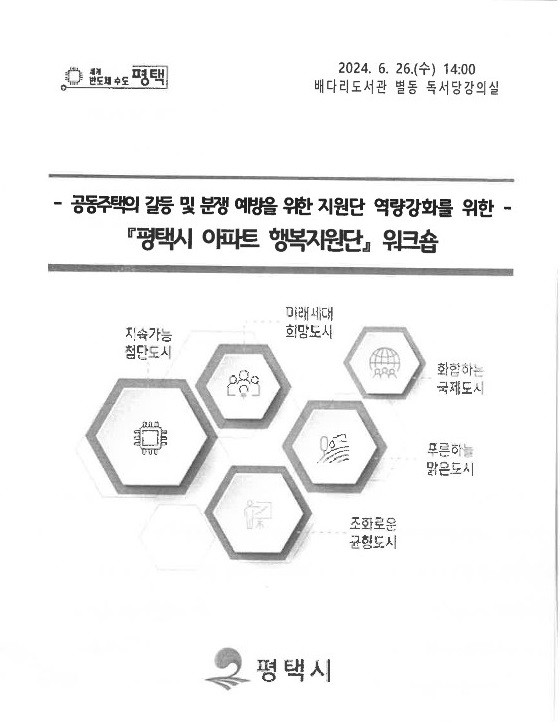 평택시 찾아가는 아파트 행복지원단은 공동주택 관리 및 운영 관련 민원과 갈등을 능동적으로 예방하고 조정하기 위해 법률, 행정 등 각 분야별 전문가로 구성되어 있습니다. 평택시는 고덕신도시를 비롯한 각종 개발사업으로 신규 아파트가 급증하고 있는데, 그만큼 관련된 공동주택 분쟁도 증가하고 있는 상황입니다.