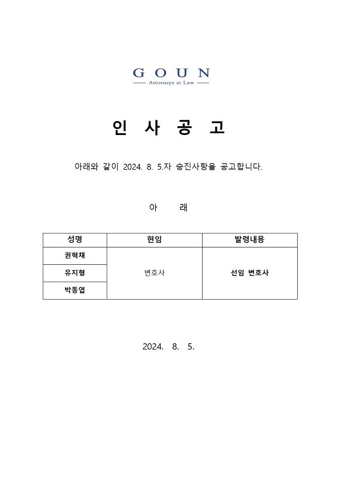 * 법무법인 고운 권혁채, 유지형, 박동엽 변호사 선임 변호사로 승진