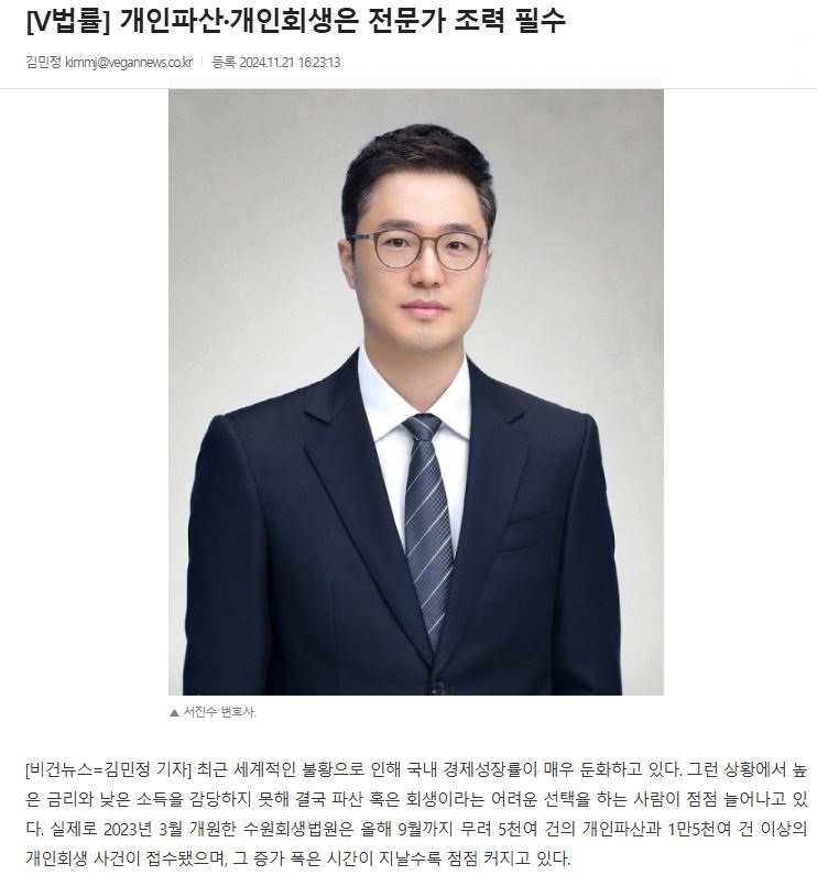 서진수 부대표변호사님은 “현재 법무법인 고운의 회생파산전담팀 팀장을 맡고 있는 입장으로써, 해당 기사가 채무로 고통받는 분들에게 조금이라도 도움이 되었다면 기쁠 것이다.”라고 그 소감을 밝히셨습니다.