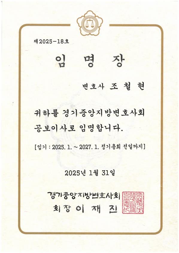 조철현 대표변호사님께서는 “경기중앙지방변호사회의 상임이사라는 중요한 자리를 맡게 되어 영광으로 생각한다. 앞으로 공보이사로서 협회의 발전에 기여하고 나아가 본 협회가 지역사회와 함께하는 변호사 단체로 발돋움 할 수 있도록 최선을 다하고 싶다.”라며 그 소감을 밝히셨습니다.