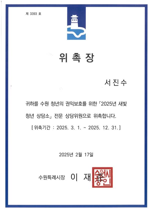 법무법인 고운 서진수 부대표변호사님께서 수원청년지원센터의 ‘새빛 청년 상담소’의 전문 상담위원으로 위촉되셨습니다.
