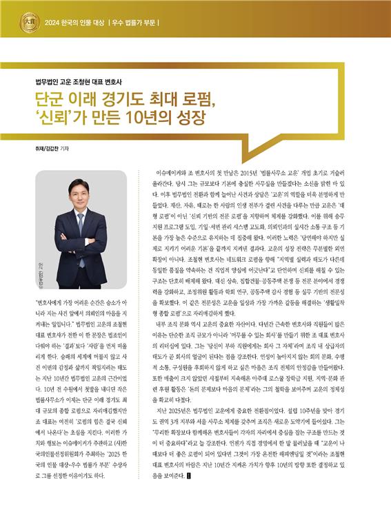 한국의 인물대상은 각 분야에서 탁월한 전문성과 책임 있는 리더십을 발휘하며, 차별화된 역량을 통해 사회 전반에 긍정적인 영향을 미친 인물에게 수여되는 상입니다. 조철현 대표변호사는 실무 중심의 깊이 있는 법률 전문성과 조직을 이끄는 통합적 리더십을 바탕으로, 법률 서비스의 공공성과 전문성 강화에 기여한 점을 높이 평가받아 이번 수상자로 이름을 올렸습니다.