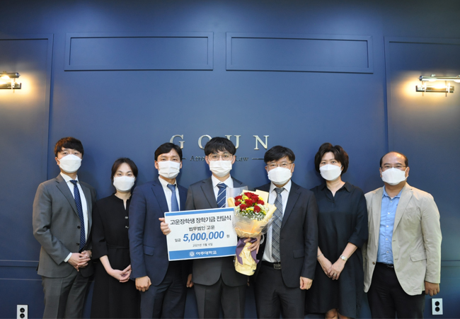 법무법인 고운은 미래 법조인 양성을 위한 사회적 책임을 실천하고자 아주대학교 법학전문대학원에 ‘고운장학금’을 설립하였습니다.