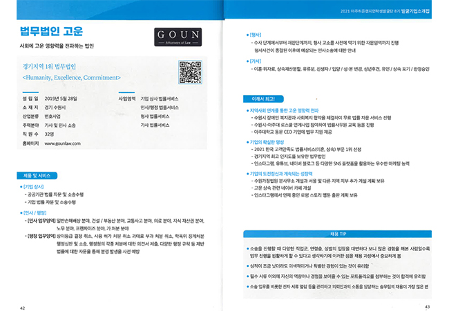 이러한 활동의 성과가 인정되어 지역 대학에서는 고운을 경기지역 대표 로펌 및 우수 중견기업으로 선정하는 영예를 안겼습니다.