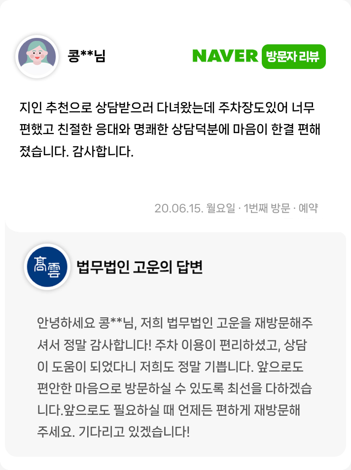 친절한 응대와 명쾌한 상담덕분에 마음이 한결 편해졌습니다. 감사합니다.