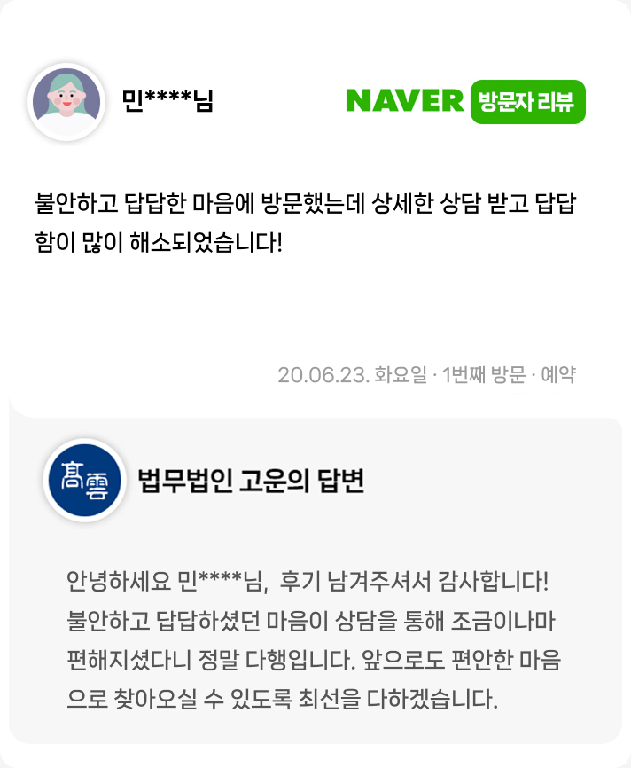 불안하고 답답한 마음에 방문했는데 상세한 상담 받고 답답함이 많이 해소되었습니다.