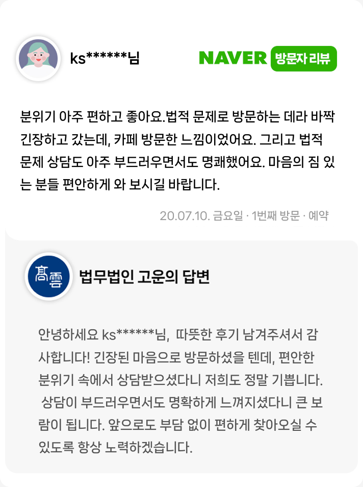 법적 문제 상담도 아주 부드러우면서도 명쾌했어요. 마음의 짐 있는 분들 편안하게 와 보시길 바랍니다.