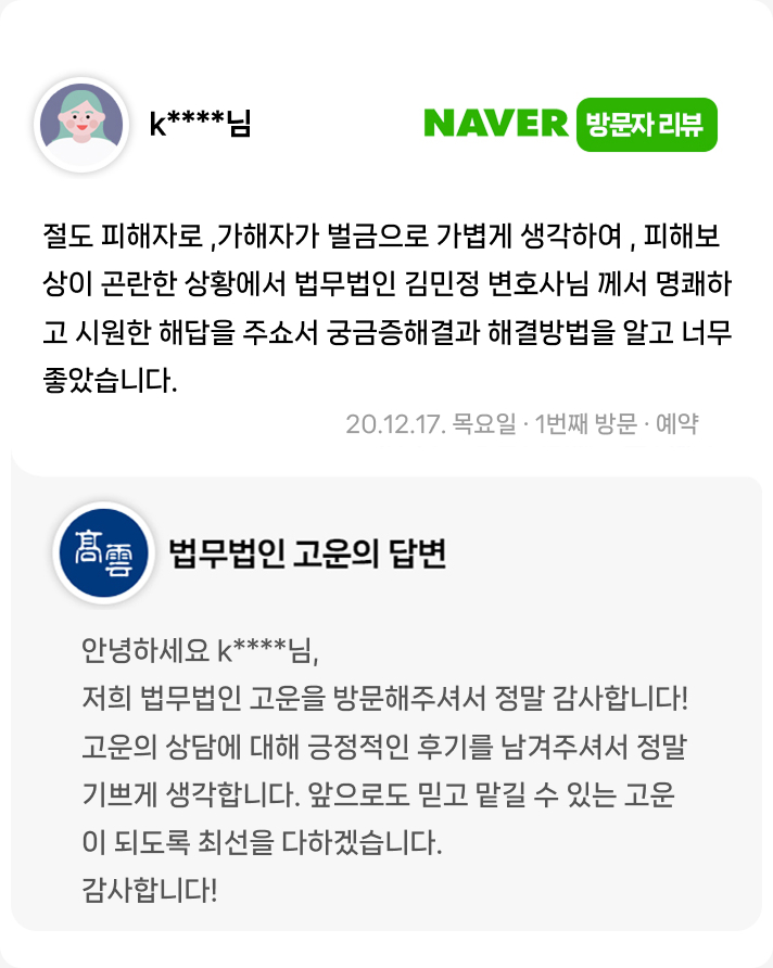 김민정 변호사님 께서 명쾌하고 시원한 해답을 주쇼서 궁금증해결과 해결방법을 알고 너무 좋았습니다.