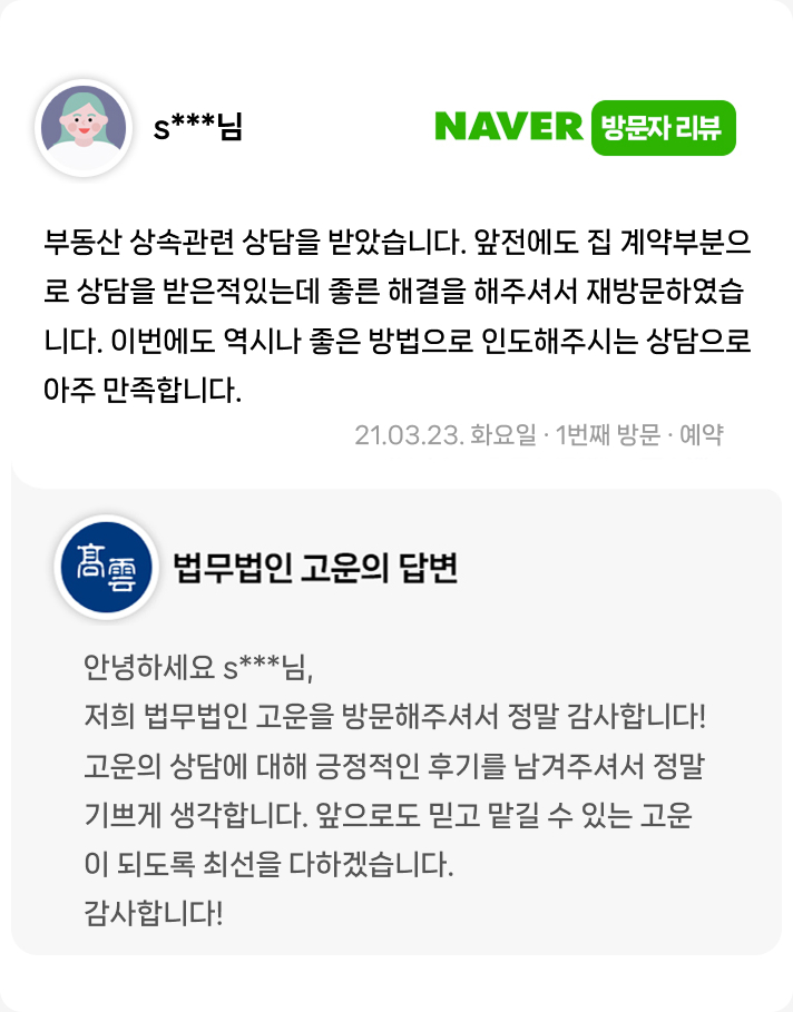 부동산 상속관련 상담을 받았습니다. 앞전에도 집 계약부분으로 상담을 받은적있는데 좋른 해결을 해주셔서 재방문하였습니다.