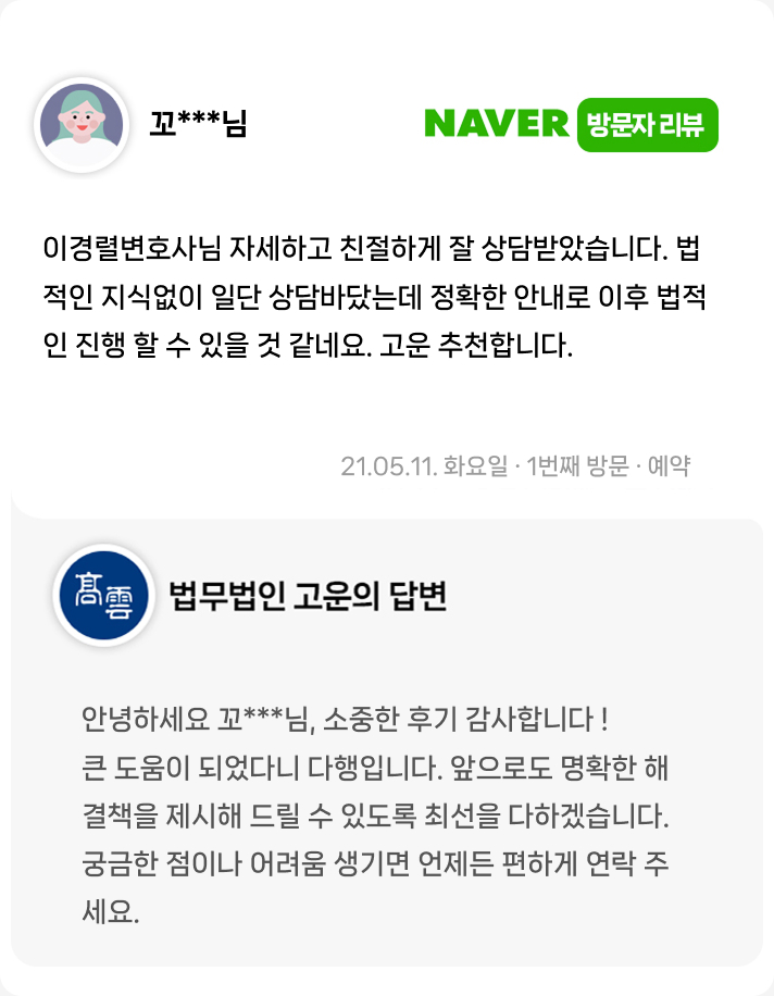 법적인 지식없이 일단 상담받았는데 정확한 안내로 이후 법적인 진행 할 수 있을 것 같네요.