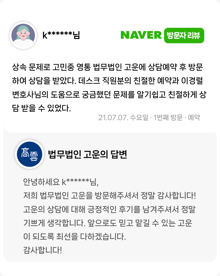 데스크 직원분의 친절한 예약과 이경렬 변호사님의 도움으로 궁금했던 문제를 알기쉽고 친절하게 상담 받을 수 있었다.