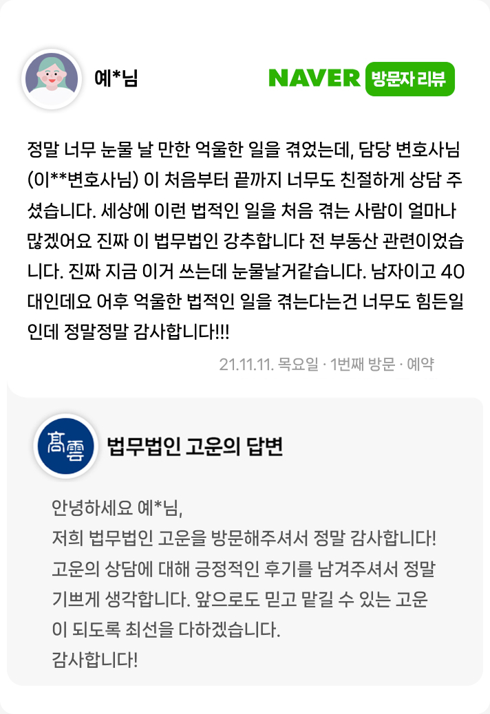 정말 눈물 날만한 억울한 일을 겪었는데, 담당 변호사님이 처음부터 끝까지 너무 친절하게 상담 주셨습니다.