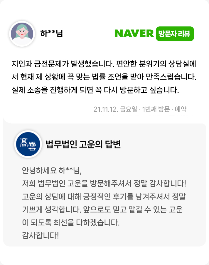 편안한 분위기의 상담실에서 현재 제 상황에 꼭 맞는 법률 조언을 받아 만족스럽습니다.