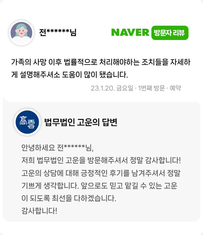 가족의 사망 이후 법률적으로 처리해야하는 조치들을 자세하게 설명해주셔소 도움이 많이 됐습니다.