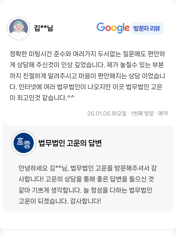법률 상담은 얼굴을 마주하고 이야기할 때 숨겨진 사실도, 말하지 못한 감정도 함께 풀어낼 수 있습니다. 당신의 이야기를 제대로 듣기 위해 고운은 방문 상담을 원칙으로 합니다 홈페이지에서 편하게 예약하실 수 있습니다.