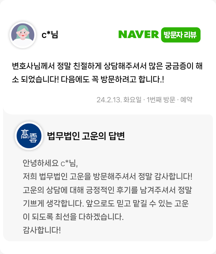 변호사님께서 정말 친절하게 상담해주셔서 많은 궁금증이 해소 되었습니다!