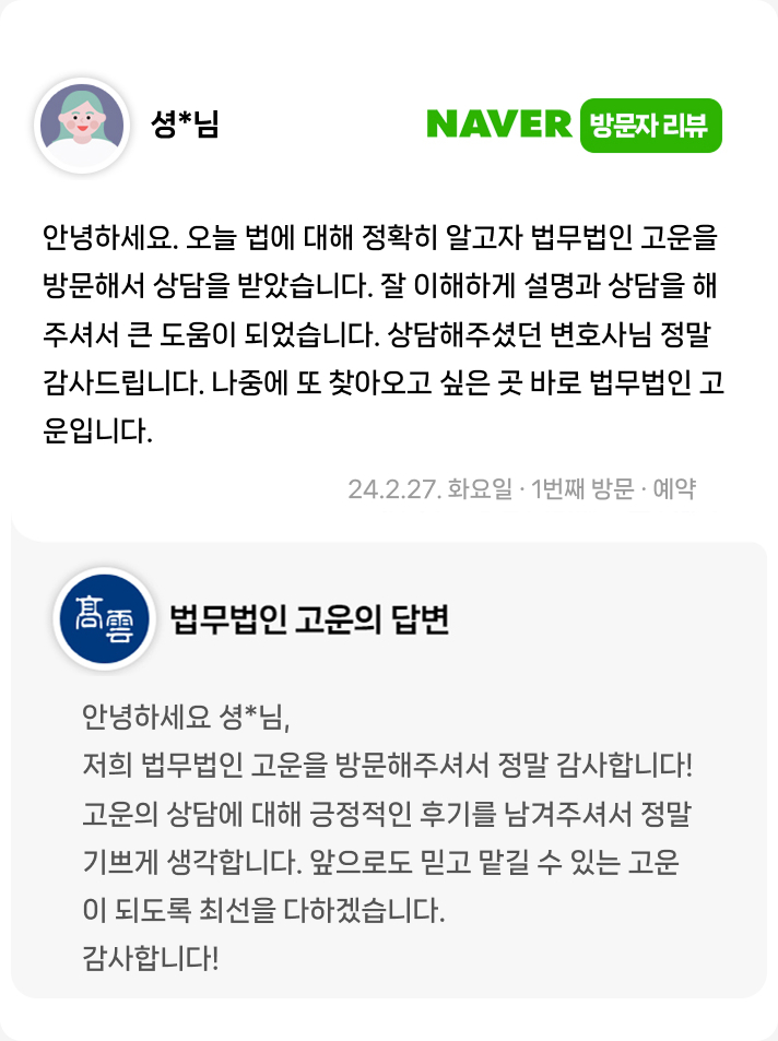 잘 이해하게 설명과 상담을 해주셔서 큰 도움이 되었습니다. 상담해주셨던 변호사님 정말 감사드립니다.